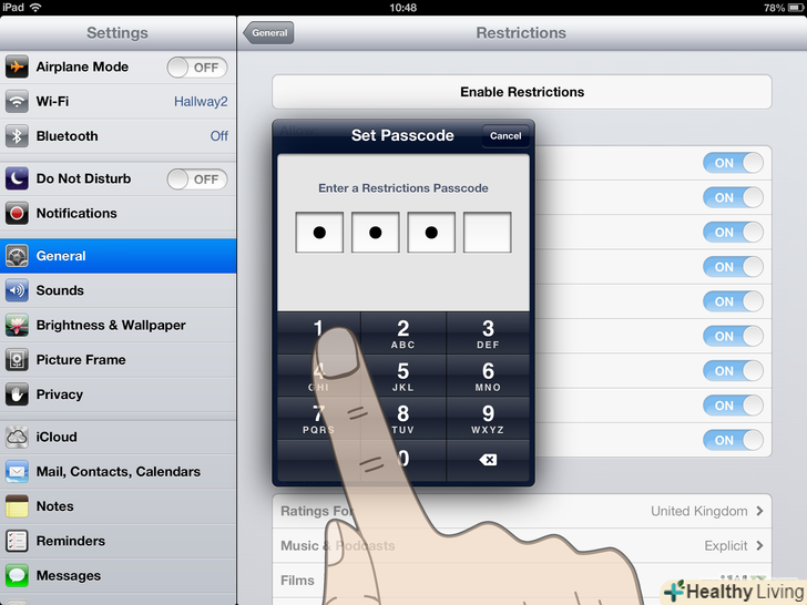 Введіть чотиризначний пароль для включення і відключення обмежень, натиснувши на цифри на екрані.тепер вам буде запропоновано ввести пароль ще раз для його підтвердження.