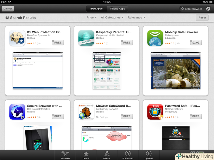 Натисніть на іконку App Store на домашній сторінці вашого iPad і пошукайте Safe Browser.користувачам доступний цілий ряд браузерів, що дозволяють блокувати сайти з непристойним змістом, і інші специфічні ресурси. "Browser for Kids", доступний одночасно в безкоштовній і платній версіях, є хорошим варіантом.