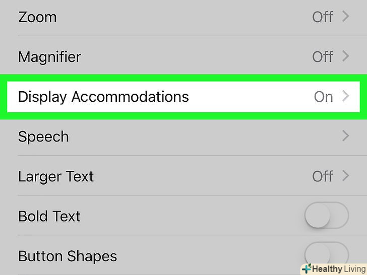 Перейдіть в розділ "адаптація дисплея". виберіть Адаптація дисплея зі списку налаштувань. Розділ "адаптація дисплея" включає в себе спеціальні налаштування для користувачів з порушеннями зору.[4]