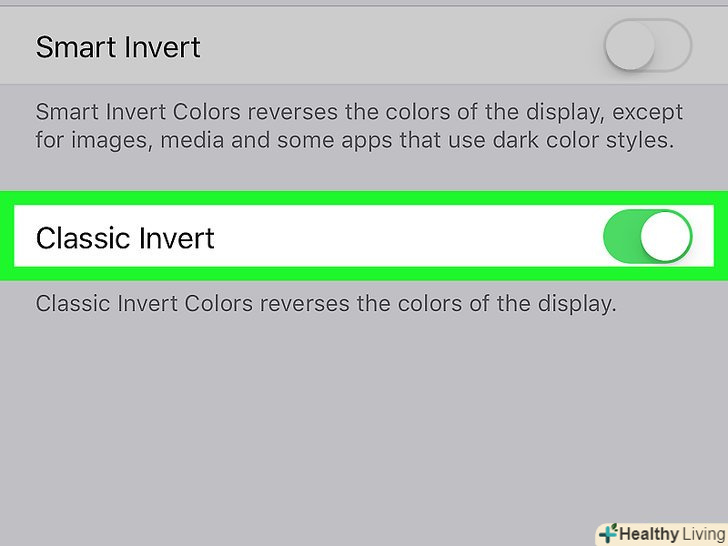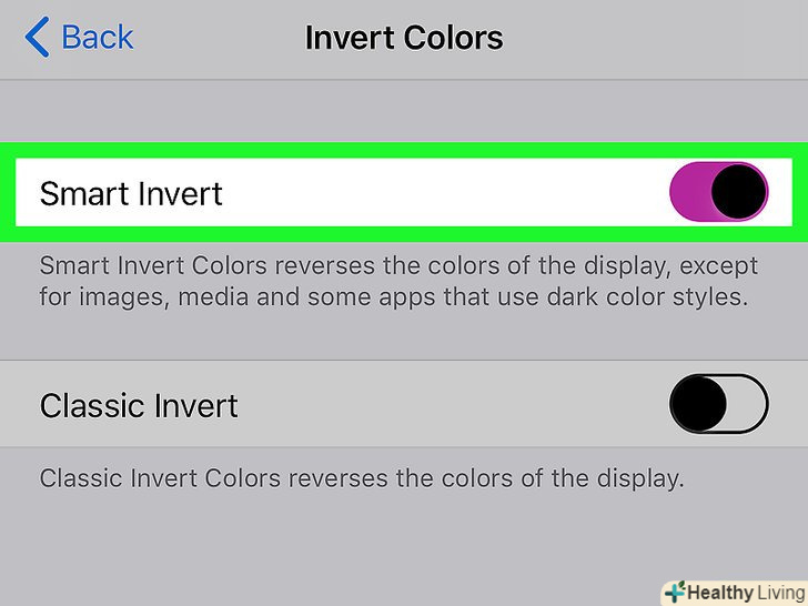 - Спробуйте змінити налаштування сполучення клавіш, щоб включати Смарт-інверсію при потрійному натисканні кнопки "Додому". Для цього відкрийте "Налаштування" gt;» Основні «gt;» Універсальний доступ «gt;» поєднання клавіш «і виберіть»Смарт-інверсія".[8]