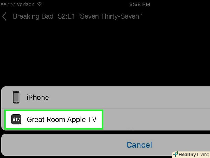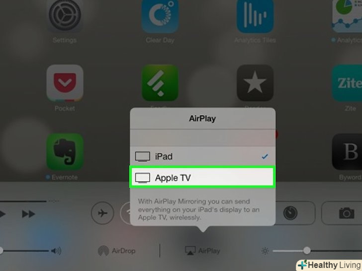 Виберіть Ім'я Apple TV.відеосигнал iPad піде на Apple TV (а не на екран iPad).- Якщо Ім'я Apple TV не відображається в меню AirPlay, переконайтеся, що iPad підключений до тієї ж бездротової мережі, що і телевізор.