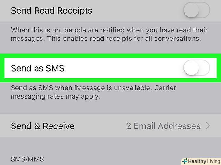 Пересуньте повзунок у «Відправляти SMS» в положення «Вимкнено».майте на увазі, що якщо одержувач повідомлення володіє смартфоном, відмінним від iPhone, він або вона не зможуть отримати ваше повідомлення.