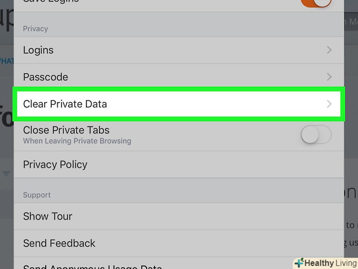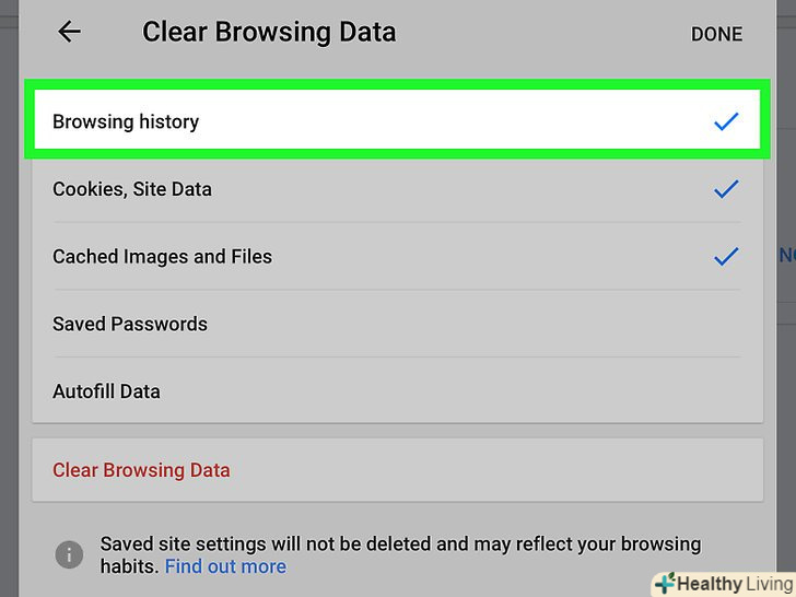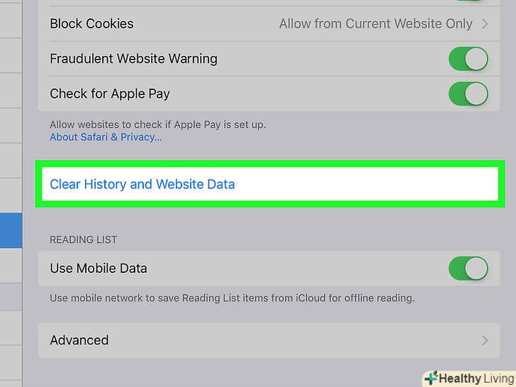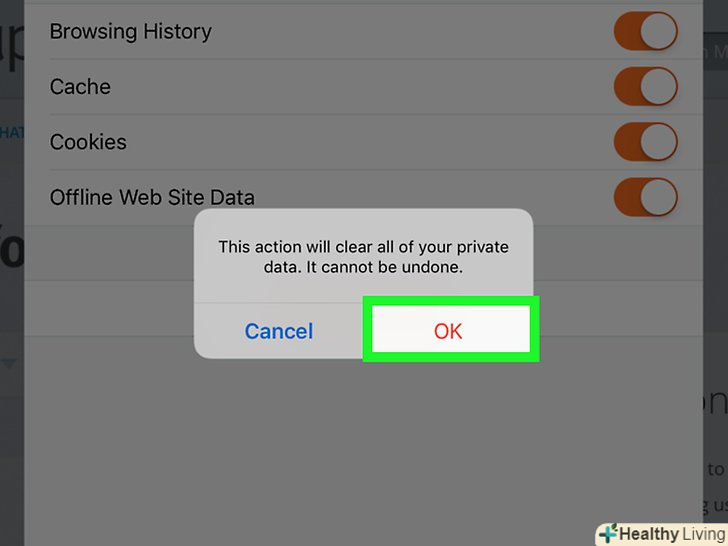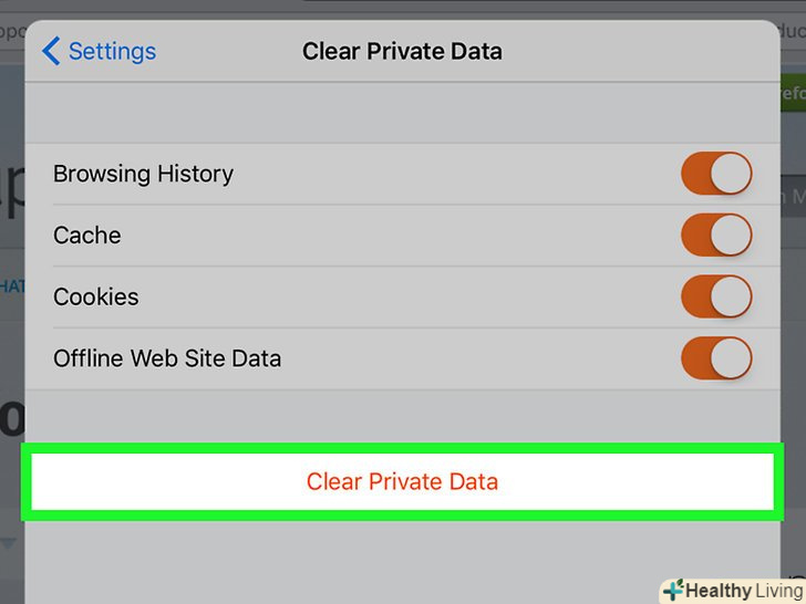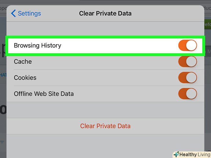 Переконайтеся, що повзунок біля опції «історія переглядів» пофарбований в помаранчевий колір. якщо це не так, клацніть по повзунку.- Клацніть по повзунках біля інших опцій (наприклад, «Кеш» і «Куки»), щоб очистити їх.