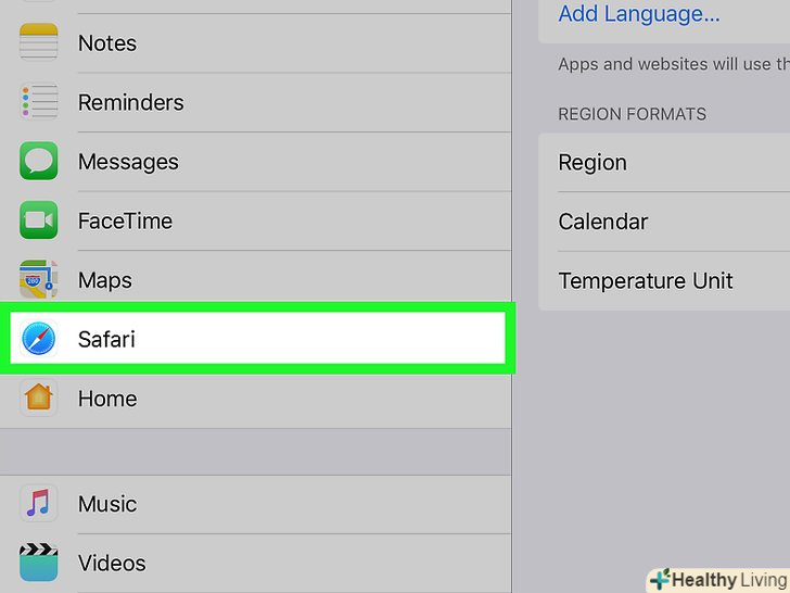 Прокрутіть вниз і натиснітьSafari.ця опція знаходиться трохи вище середини екрану. Відкриється меню Safari в правій частині екрана.- Переконайтеся, що гортаєте вміст лівій частині екрана, щоб знайти опцію "Safari".