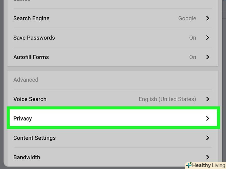 НатиснітьКонфіденційність.ця опція знаходиться в розділі "Додатково" вікна "Налаштування".