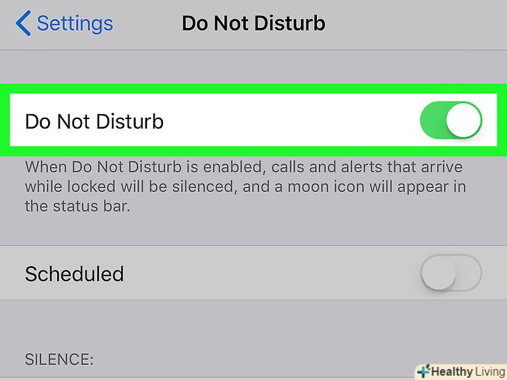 Пересуньте повзунок у «Не турбувати» в положення «Включити». повзунок стане зеленим, тобто ви включили режим»не турбувати".