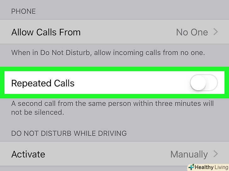 Пересуньте повзунок у «Повторні виклики» в положення «Вимкнено».якщо не вимкнути цю опцію, людина, яка подзвонить вам два рази поспіль, зможе зв'язатися з вами навіть в режимі»не турбувати". Тому вимкніть зазначену опцію.