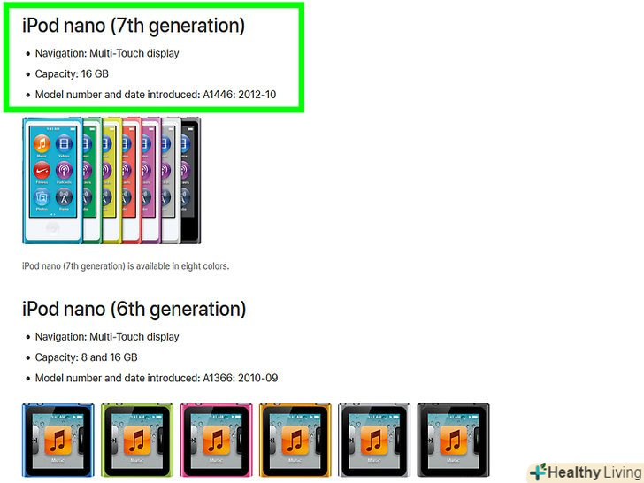 Зіставте модель iPod зі своїм iPod.під поколінням моделі ви знайдете список її функцій. Якщо функції, перераховані на сайті, відповідають функціям вашого iPod, ви дізналися покоління свого пристрою.- Якщо функції не збігаються з функціями вашого пристрою, перейдіть до наступного покоління.