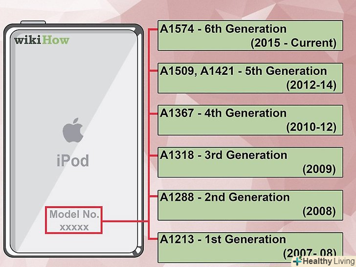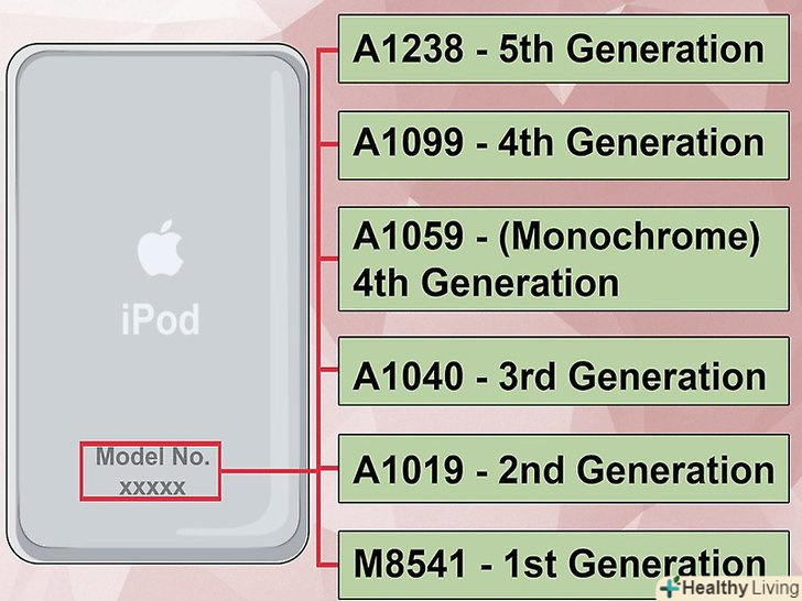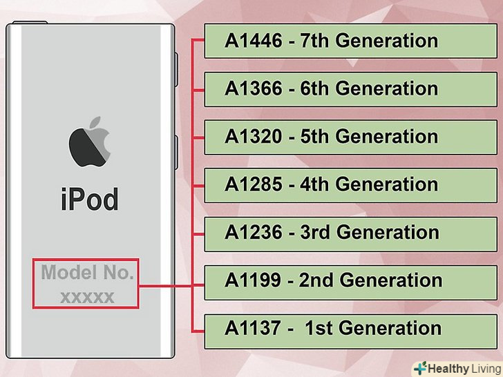 З'ясуйте покоління iPod за номером моделі. якщо ви не можете визначити покоління iPod за допомогою картинок на сайті Apple або просто хочете перевірити покоління свого iPod, виконайте наступні дії:- Знайдіть номер моделі iPod (це п'ятисимвольний код біля слова "Model" (Модель) на задній панелі iPod).