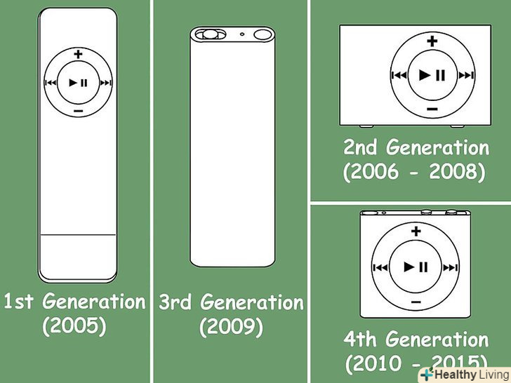 Зверніть увагу на форм-фактор. Корпус iPod Shuffle маленький і без екрану. Покоління iPod Shuffle можна визначити за такими візуальними ознаками:- Квадратний корпус, кнопки розташовані по колу: iPod Shuffle 4-го покоління (2010-2015).