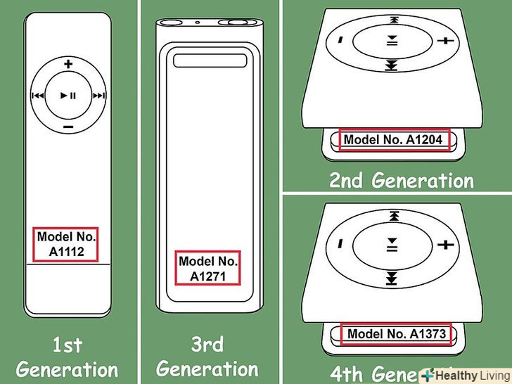 Дізнайтеся номер моделі. він нанесений дрібним шрифтом:[2]- A1373: iPod Shuffle 4-го покоління (номер моделі вказаний на деталі затиску, яка торкається до основи).