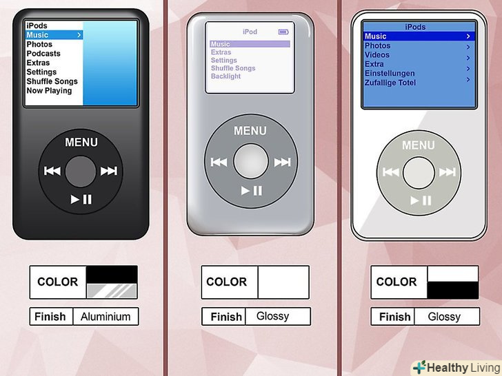 Зверніть увагу на колір iPod. Він дозволить розрізнити моделі нових поколінь.- 6-е покоління (моделі iPod Classic lt;числоgt; GB) забарвлене в сріблястий або чорний колір і має анодовану обробку з алюмінію.