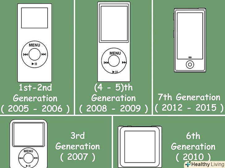Зверніть увагу на форм-фактор.iPod Nano випускався в корпусах п'яти форм, завдяки яким можна з'ясувати вік пристрою.- Прямокутний корпус і сенсорний екран: iPod nano 7-го покоління (2012-2015).