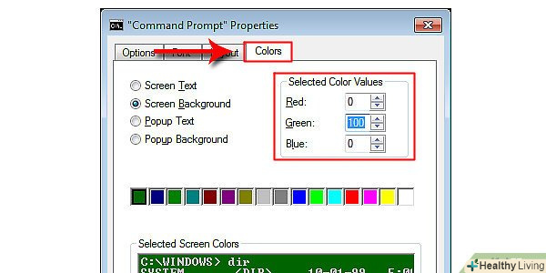 Задайте колір тексту, фону і спливаючих вікон.зробіть це на вкладці «кольори». У розділі "вибраний колір" можна задавати кольори за допомогою чисел. Наприклад, щоб задати темно-зелений колір, в рядку «Червоний» введіть 0, в рядку «Зелений» 100, в рядку «Синій» 0.