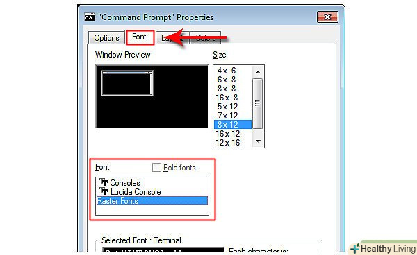 Перейдіть на вкладку "Шрифт". на ній можна вибрати шрифт, а саме "точкові шрифти «(обраний за замовчуванням) або»Lucida Console". На даному етапі доступні тільки ці два шрифти, але в наступному розділі ви дізнаєтеся, як додавати нові шрифти.