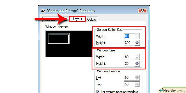 Клацніть по вкладці "розташування". знайдіть там розділи "розмір буфера екрану" і»розмір вікна".- У розділі "Розмір вікна" можна задати розмір активного ВІКНА.