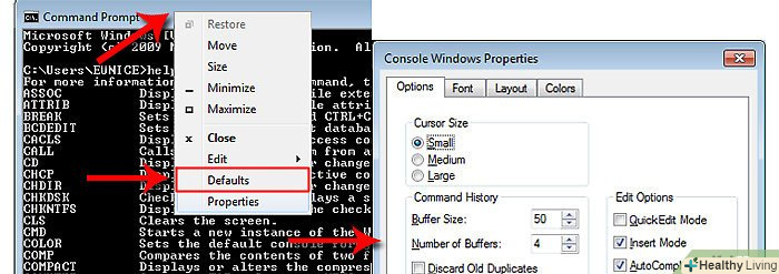 Правою кнопкою миші клацніть по верхній частині (заголовку) вікна командного рядка і в меню виберіть «умовчання». вікно, яке відкриється, буде абсолютно таким же, як вікно "Властивості", але будь-які зміни, зроблені в даному вікні, будуть застосовані до всіх вікон командного рядка (незалежно від ярлика).
