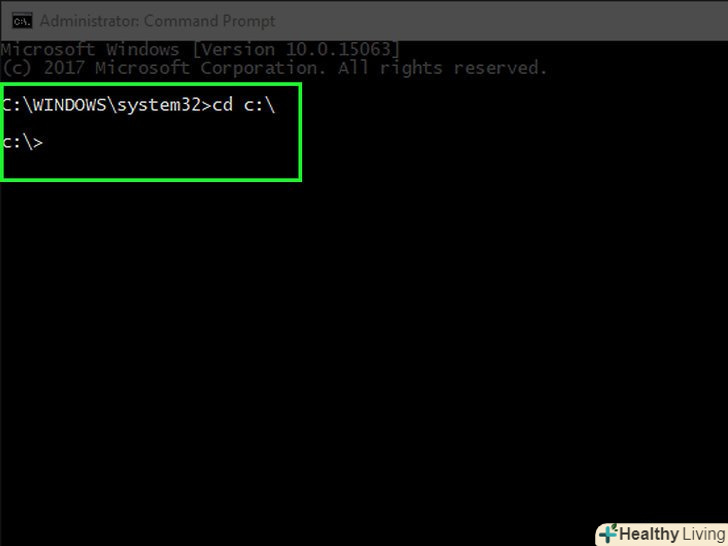 Зрозумійте, що робити далі.швидше за все, зараз ви думаєте, що своїми діями пошкодите систему — це можливо, якщо не знати, що робити. Тому спочатку навчитеся переміщатися між каталогами.- ВведітьCD c:\ натисніть ↵ Enter. Ви перейдете з поточного каталогу в кореневий каталог диска C:. Далі ми навчимо вас відображати всі файли і папки, які знаходяться в цьому каталозі.