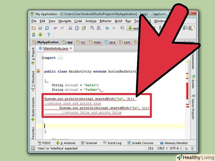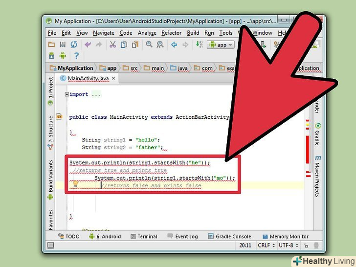Використовуйте логічний метод startsWith (String prefix), щоб порівняти початок рядка. цей метод класу String порівнює початок рядка з вказаним префіксом (prefix). Це логічний метод, тому він повертає лише два значення: true (істина) або false (брехня). Використовуйте наступний код і одну зі створених рядків. Представлений код поверне обидва значення (true і false) і виведе результати на екран. Спочатку повернеться значення true, а потім значення false.System.Out.Println(String1.StartsWith(" пр ")); / / повертає true і виводить true System.Out.Println(String1.StartsWith(" ма ")); / / повертає false і виводить false
