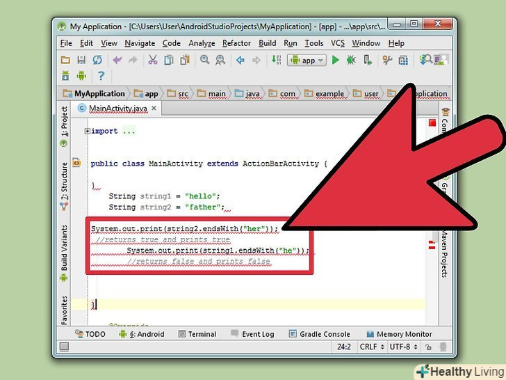 - Примітка: У цій ситуації метод (myString1 == myString2) поверне значення false (брехня). Навіть якщо рядки " abc " ідентичні, myString1 і myString2 є двома різними об'єктами класу String. Оператор "» = " порівнює об'єкти, а метод .equals() порівнює значення рядків.