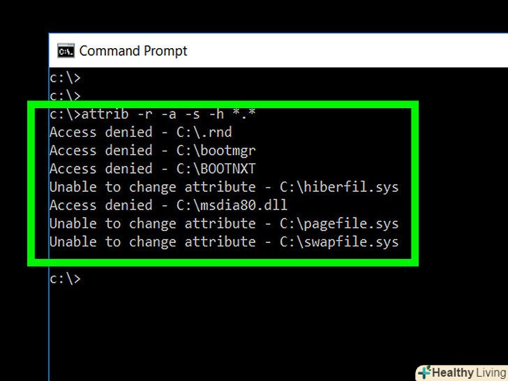 Введітьattrib-R-A-s-h *.* у командному рядку. Команда "attrib «відобразить в командному рядку всі приховані, заархівовані і системні файли, а параметри" - r-A-s-h *.* "видалять ці атрибути з шкідливих файлів.- Атрибути нормальних системних файлів видалені не будуть-зліва від них відобразиться "Access Denied" (Доступ заборонений).