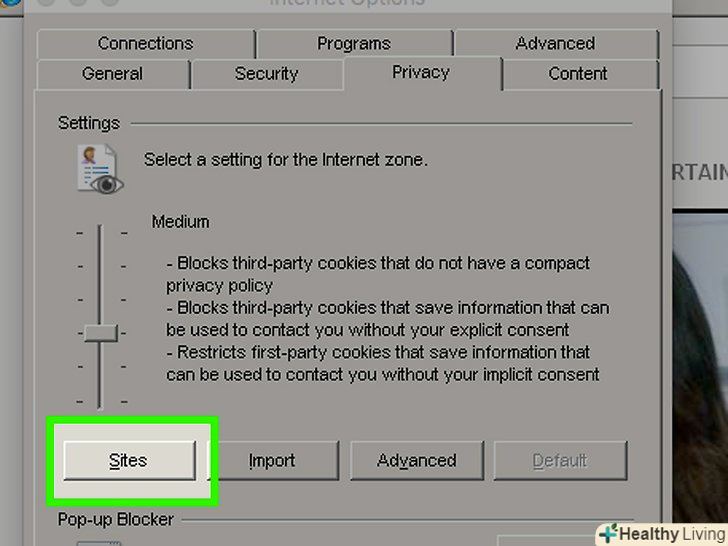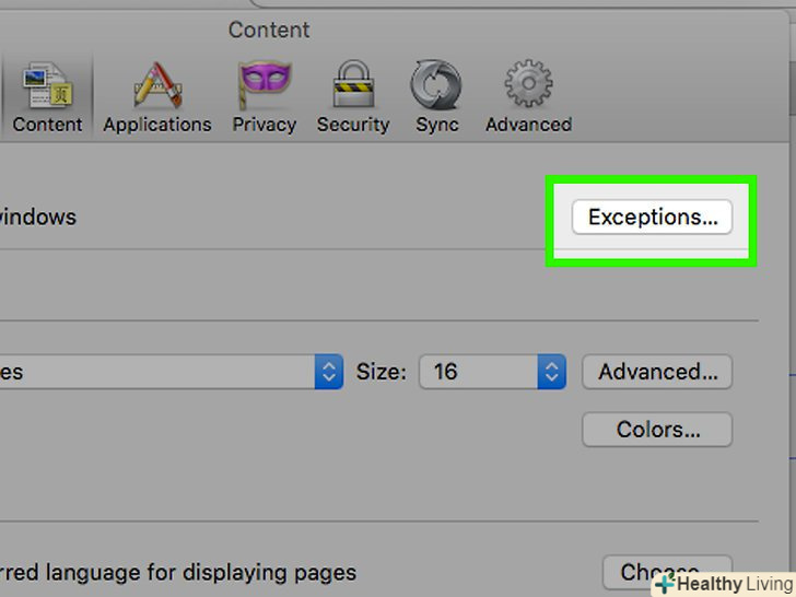 Натисніть < span class="nowrap" title="This is not a clickable button; it illustrates the button one should find." style="font-family: Segoe UI, Frutiger, Frutiger Linotype, Dejavu Sans, Helvetica Neue, Arial, sans-serif;letter-spacing:0px;padding:0em .6em; border:1px solid; border-color:#AAA #555 #555 #AAA; -moz-border-radius: 0px; -webkit-border-radius: 0px; border-radius: 0px; background-color: #F2F2F2; background-image: -moz-linear-gradient(top, #FCFCFC, #E0E0E0); background-image: -o-linear-gradient(top, #FCFCFC, #E0E0E0); background-image: - webkit-linear-gradient(top, # FCFCFC, #E0E0E0); background-image: linear-gradient(top, #FCFCFC, #E0E0E0);">виключення. ця кнопка знаходиться праворуч від заголовка «спливаючі вікна "(посередині сторінки).