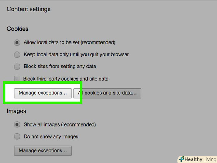 У розділі «Файли cookie» натиснітьНалаштувати виключення. Це перший розділ вікна «Налаштування контенту».