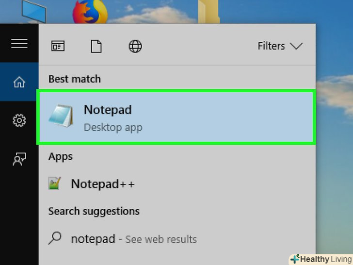 Знайдіть і запустіть Блокнот. Найбільш простий спосіб запустити Блокнот — відкрити меню «Пуск», ввести блокнот, а потім натиснути на синю іконку Блокнота у верхній частині меню "Пуск".