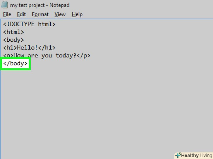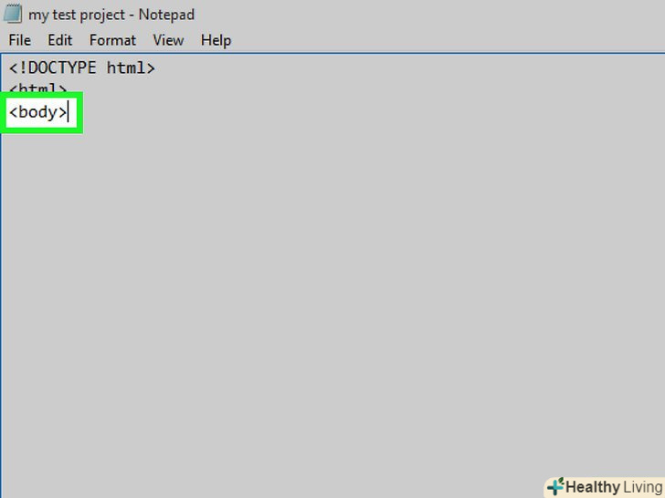 Визначте текстовий розділ програми. введіть в Блокнотbodyі натисніть ↵ Enter. Цей рядок вказує, що далі в документі буде йти розділ інформації (в даному випадку текст).