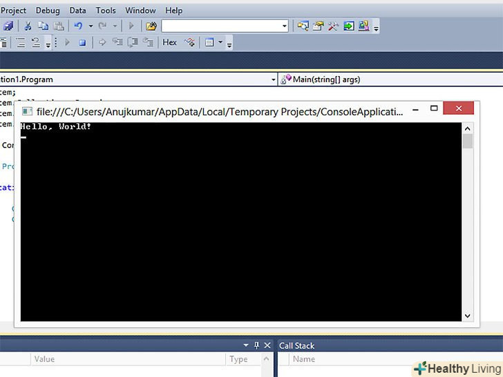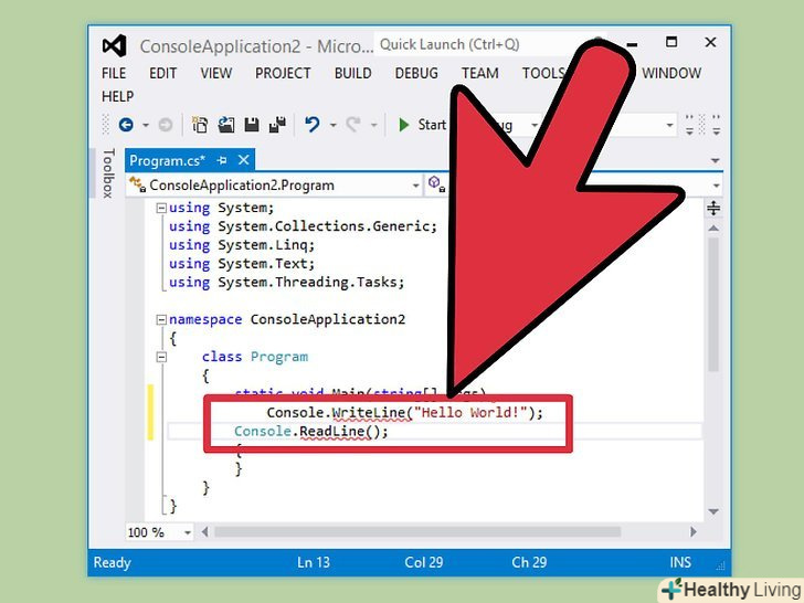 Підstatic void Main (string[] args)і після першої фігурною дужкою вбийте наступне:Console.WriteLine("Hello, World!"); Console.ReadLine();