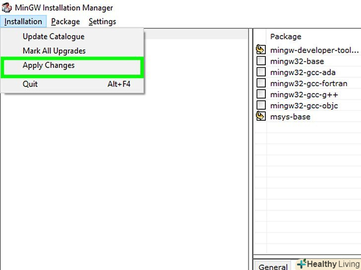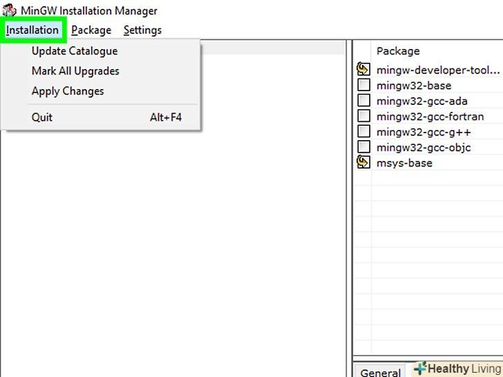 Відкрийте меню < span class="nowrap" title="This is not a clickable button; it illustrates the button one should find." style="font-family: Segoe UI, Frutiger, Frutiger Linotype, Dejavu Sans, Helvetica Neue, Arial, sans-serif;letter-spacing:0px;padding:0em .6em; border:1px solid; border-color:#AAA #555 #555 #AAA; -moz-border-radius: 0px; -webkit-border-radius: 0px; border-radius: 0px; background-color: #F2F2F2; background-image: -moz-linear-gradient(top, #FCFCFC, #E0E0E0); background-image: -o-linear-gradient(top, #FCFCFC, #E0E0E0); background-image: - webkit-linear-gradient(top, # FCFCFC, #E0E0E0); background-image: linear-gradient(top, #FCFCFC, #E0E0E0);">Installation (Установка). воно знаходиться у верхньому лівому кутку MinGW.
