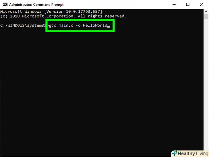 Введітьgcc helloworld.c -o helloworld.exe. Замініть» helloworld " на ім'я файлу з вихідним кодом і ім'я програми. По завершенні компіляції програми ви повернетеся в командний рядок, при цьому не буде ніяких повідомлень про помилки.[4]- Будь-які помилки програмування повинні бути усунені перед компіляцією програми.