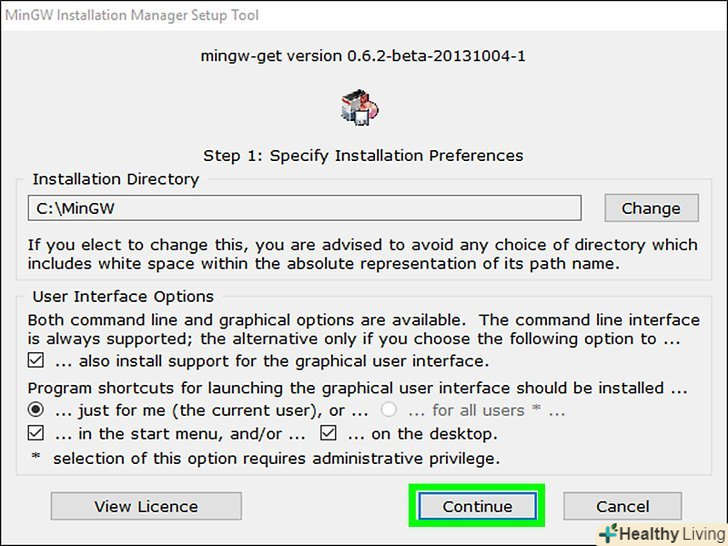 Задайте параметри установки і натиснітьContinue (далі).- Рекомендуємо встановити MinGW в папку за замовчуванням, а саме в (C:\MinGW). Якщо потрібно поміняти папку, не вибирайте папку, в назві якої присутні прогалини, таку як «Program Files».[3]