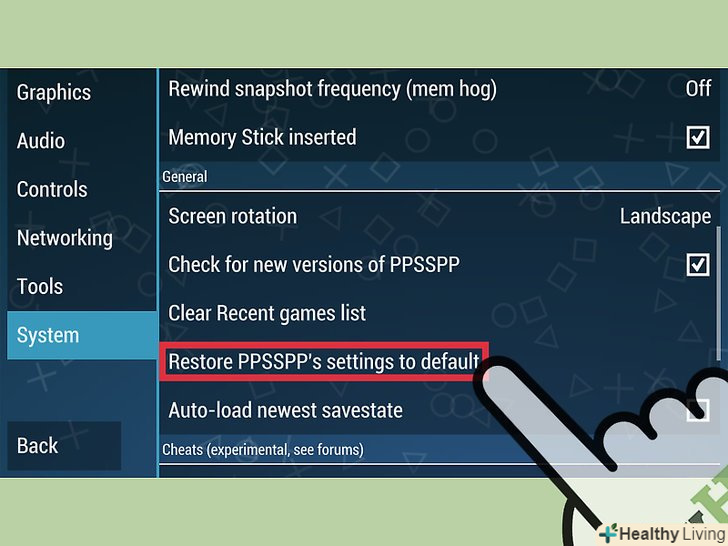Скидання налаштувань в PPSSPP до стандартних допоможе усунути несправності в тих іграх, які неправильно працюють або в яких виник збій. При повному скиданні всі налаштування, за винятком призначених для користувача прив'язок клавіш контролера, будуть видалені і скинуті до початкового стану. Налаштування контролера і призначення кнопок контролера або клавіатури можна скинути в розділі "Управління".