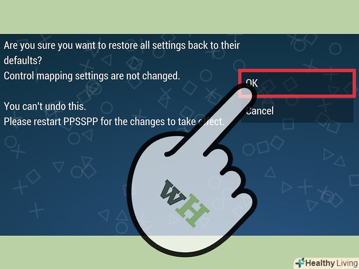 Підтвердіть бажання скинути налаштування. Прив'язки кнопок управління залишаться на місці, але всі інші настройки будуть скинуті до початкових і це рішення вже не можна буде скасувати.[1]- Налаштування графіки, аудіо, емулятора, системні налаштування та налаштування мережі повернуться у початковий стан.