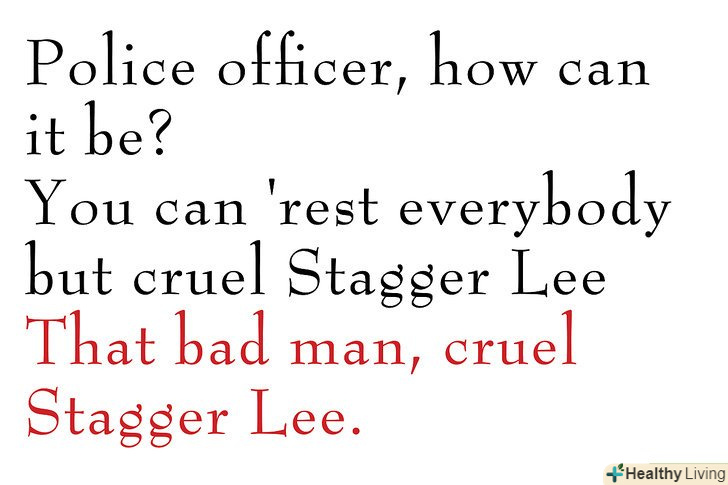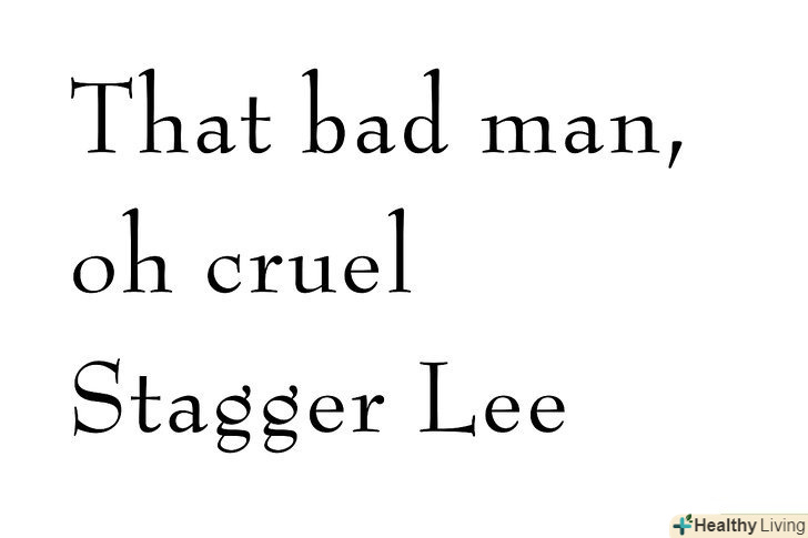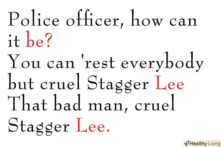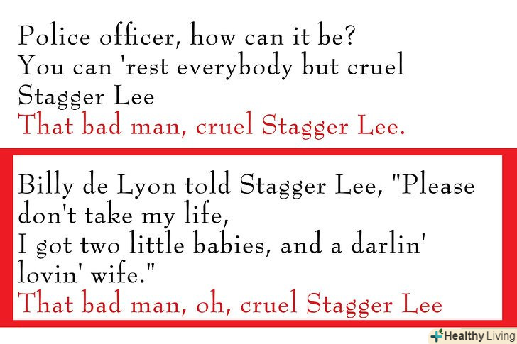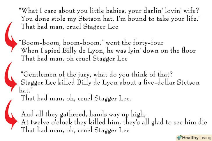 Майте на увазі, що деякі балади як Стаггер Лі, можуть мати Приспів у кожному куплеті.в такому випадку, римова схема це ААВ або АВАС (дивіться вище).- Ті рядки, які римуються, повинні мати ту ж кількість склад і наголос має бути на однакових складах.