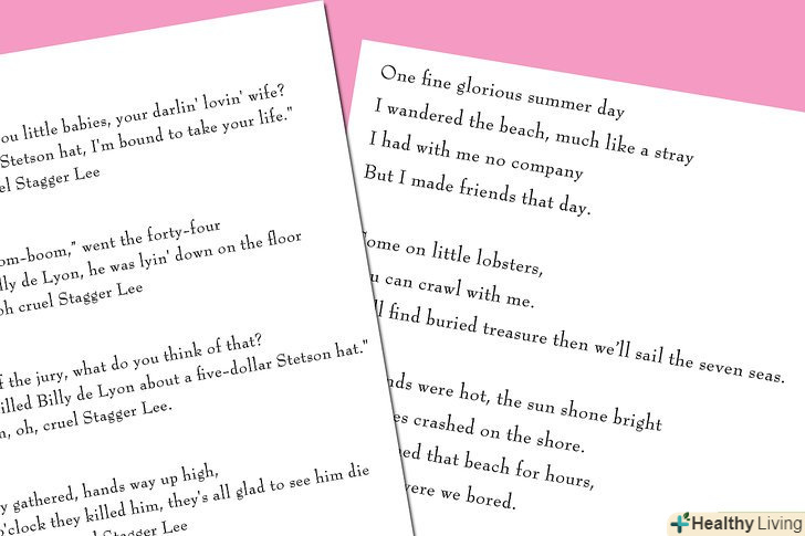 Придумайте ритм і Риму пісні.балади, як правило, мають куплет з чотирьох віршів, з яких два або більше римуються (Блюз балади з іншого боку мають два рядки з римою, і одну вільну рядок). Щоб визначиться з ритмом і римою вашої балади, напишіть перший куплет вільно, і по ньому вже будуйте інші (намагайтеся, щоб кожен куплет мав той же ритм, ті ж рими і ту ж довжину, що і перший).[5]- АА Рима, це коли перший і другий рядок закінчуються в риму.
