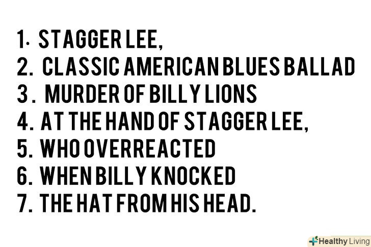 Виділіть найважливіші події.балади пропускають не цікаві моменти тієї історії, яку вони описують, щоб можна було більше часу приділити цікавим частинам. Щоб повторити такий стиль опису подій, просто залиште осторонь передісторію і другорядні деталі, які можуть відвернути читача від основного сюжету.- Stagger Lee, балада яку ми наводить у приклад в цій статті, це класична американська блюз Балада, про вбивство Біллі Лайонс рукою Стаггера Лі, який занадто сильно відреагував, на те, що Біллі збив його шапку з голови. Такі непристойні історії, роблять найпопулярніші балади.