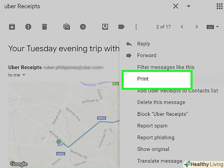 Відкрийте лист з квитанцією.натисніть на лист від Uber про поїздку, для якої потрібно роздрукувати квитанцію. Якщо у» вхідних "квитанції від Uber немає, перевірте папку" Спам»або "Небажана пошта".- Якщо у вас виникли проблеми з пошуком листа, спробуйте пошукати по ключовому слову "Uber" в поштовому сервісі, щоб побачити всі листи, які ви отримали від Uber.