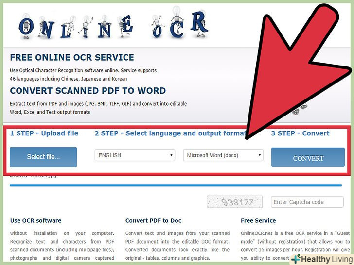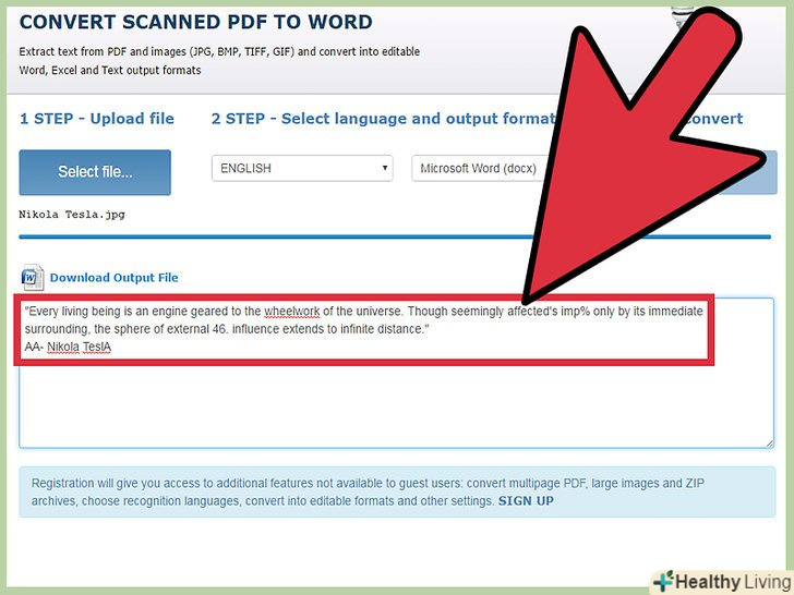 - Безкоштовні сайти. Ці рекламовані, але функціональні сайти зазвичай підтримують TIF, GIF, PDF, JPG, BMP, PNG та інші формати. Вони часто мають обмеження на розмір завантажуваних файлів (наприклад, до 5 МБ). Одні сайти безкоштовно відправляють документ Word або інший файл, що містить витягнутий текст, по електронній пошті, інші ж просто надають текст для копіювання. Ось деякі з них: