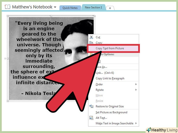 Клацніть правою кнопкою миші по зображенню і виберіть "Копіювати текст з малюнка". Текст на зображенні буде скопійований в буфер обміну комп'ютера.- У Windows, якщо замість малюнка в другому кроці ви виберете "роздруківка«, клацання правою кнопкою миші по сторінці роздруківки дасть вам дві альтернативні опції:» копіювати текст з цієї сторінки роздруківки «і»копіювати текст з усіх сторінок роздруківки". Виберіть ту, яка Вам підходить.
