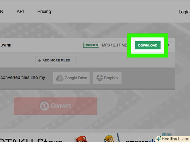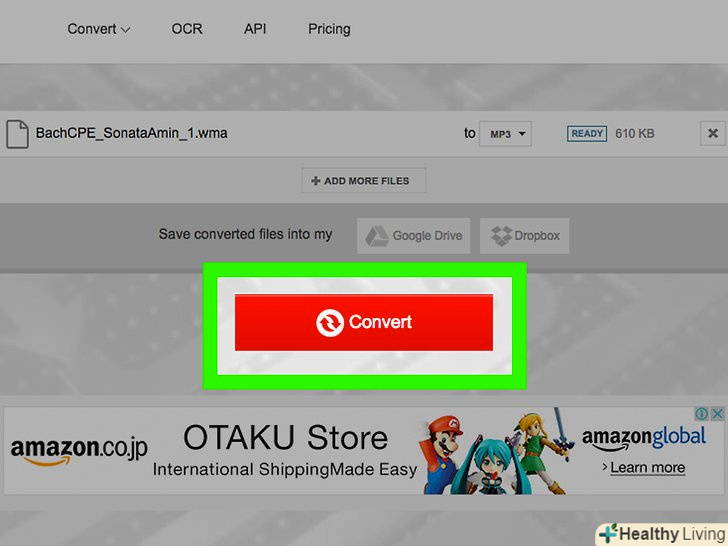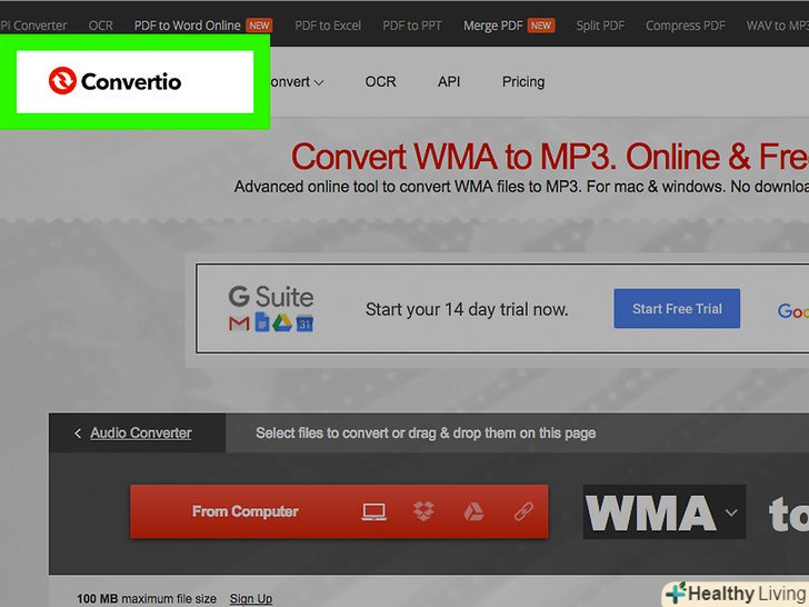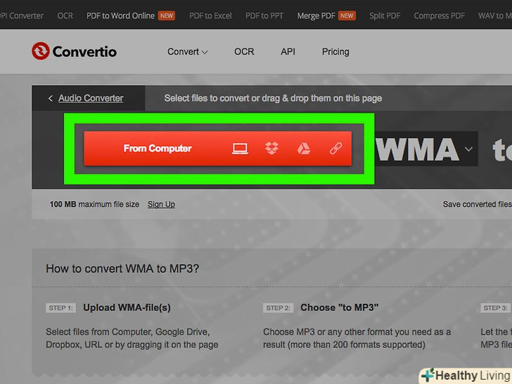 Перейдіть на сторінкуHttps://convertio.co/ru/wma-mp3/ у веб-браузері.- Convertio-це безкоштовний онлайн-конвертер, в який можна завантажити WMA-файл розміром до 100 МБ, конвертувати його і завантажити MP3-файл на комп'ютер, в Dropbox або в Google Диск.