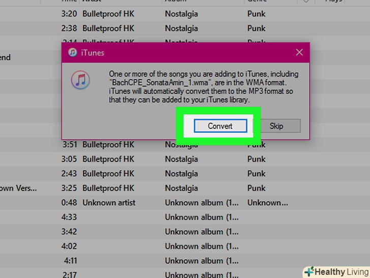 НатиснітьКонвертувати.і оригінальний WMA-файл, і перетворений mp3-файл з'являться в музичній бібліотеці iTunes.- Якщо ви хочете перетворити файл WMA, який вже є в бібліотеці iTunes, клацніть правою кнопкою миші на файлі та виберіть "Створити MP3".