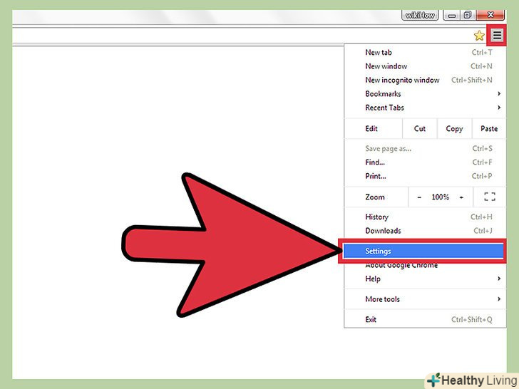 Відкрийте меню браузера, натиснувши на кнопку у вигляді трьох паралельних прямих (у верхньому правому куті вікна браузера). В меню виберіть «Налаштування».