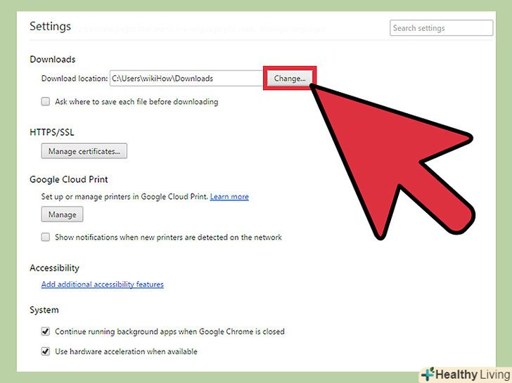 В опції "розташування завантажуваних файлів" ви можете задати шлях до папки для скачування (папці, в яку поміщаються викачані файли).- Якщо ви хочете змінити папку, задану за замовчуванням, натисніть "Змінити" (праворуч від опції "розташування завантажуваних файлів"). У вікні, знайдіть і виділіть потрібну папку, а потім натисніть OK.
