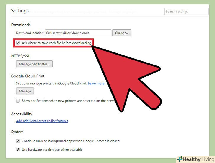 Друга опція « "Запитувати місце для збереження кожного файлу перед завантаженням".позначте її, якщо ви хочете зберігати викачані файли в різних папках. В цьому випадку перед кожним завантаженням буде відкриватися вікно, в якому ви зможете вибрати необхідну папку.- Скористайтеся цією опцією, Якщо ви впорядковуєте викачані файли за типом / контенту.