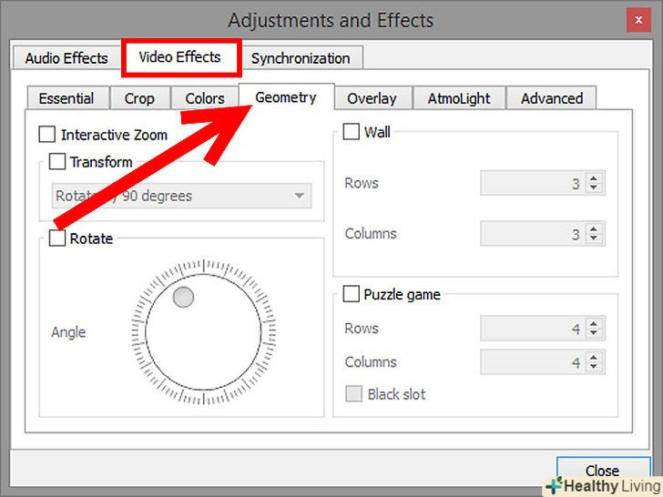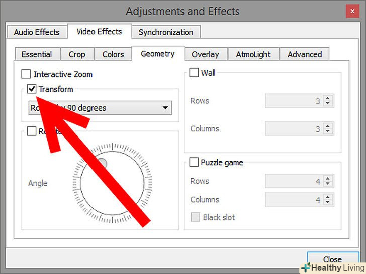 Поставте галочку на поле "Transform".активується інше меню. Ви зможете повернути на 90°, 180°, 270°, а також перевернути і транспонувати зображення. Закрийте віконце "Adjustments and Effects", коли закінчите.- Якщо ви хочете вільно обертати відео, поставте галочку на поле "Rotate". Включиться опція цифрового кутоміра. Клацніть і перетягніть повзунок, щоб повернути відео на потрібний для вас кут.[3]