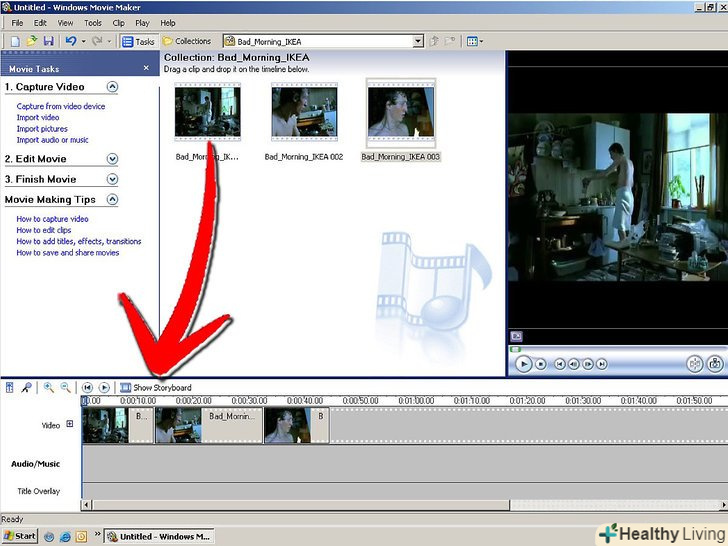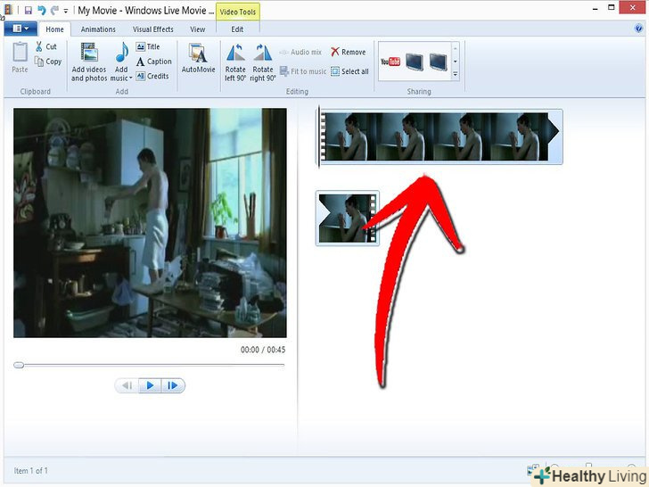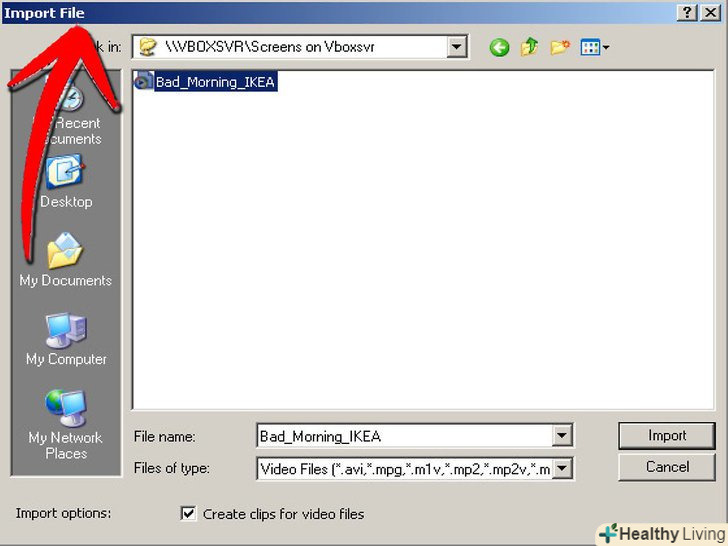 Зробіть Імпорт відео в Movie Maker.виберіть опцію "Відео" з меню імпорту. Знайдіть відео, відкрийте його. Воно з'явиться у вікні програми.
