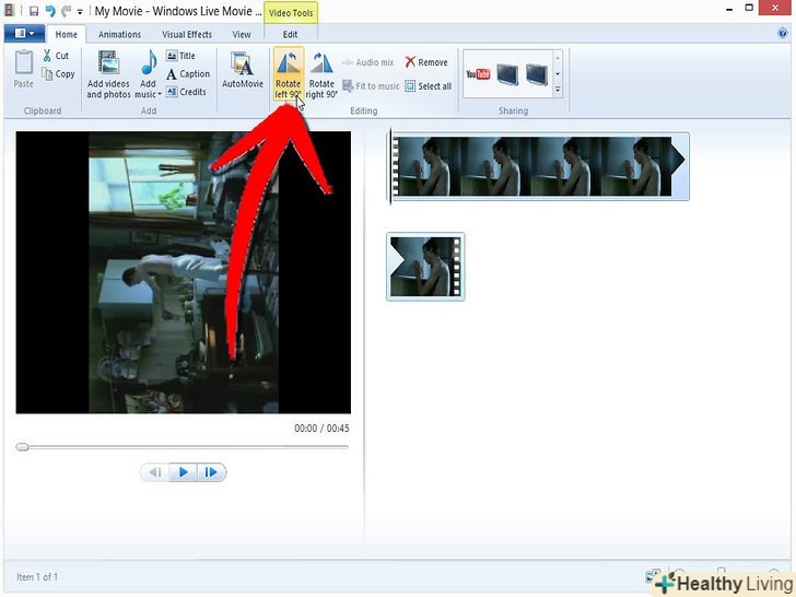 Поверніть відео.у вкладці Home, знайдіть іконки повороту в секції Editing. Клацніть на кнопку "Rotate left" або "Rotate right", щоб повернути відео на 90°.