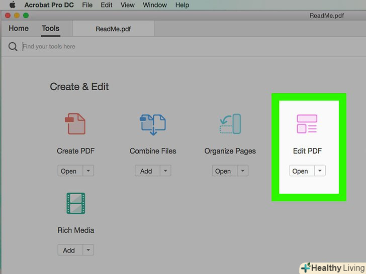 Переконайтеся, що на комп'ютері встановлена платна версія Adobe Acrobat.у програмі Adobe Acrobat Reader, яка є у багатьох користувачів, можна відкрити, але не відредагувати PDF-документ. Щоб відредагувати PDF-файл, необхідно скористатися платною програмою Adobe Acrobat Pro.- Безкоштовну пробну версію Adobe Acrobat Pro можна завантажити на цьому сайті, Щоб безкоштовно користуватися потрібними функціями протягом обмеженого часу.